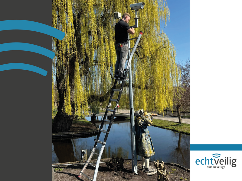 Bij deze woning zijn twee camera's op een paal geïnstalleerd voor optimaal overzicht over de tuin. Door de verhoogde en centrale plaatsing blijft het hele terrein goed in beeld. Een slimme oplossing voor grotere buitenruimtes waar overzicht belangrijk is. Netjes geplaatst en perfect afgestemd op de situatie.